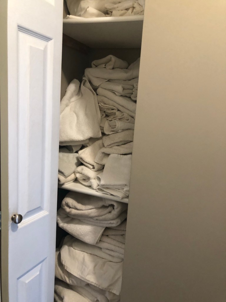 It’s okay to have extra sheet sets, although realistically, we only really need one extra set! My mom had several old sets of sheets & some weren’t even the right size for her King sized bed! I organized the sheets & folded the 2 extra flat sheets, and rolled up the fitted sheets / pillow cases for an easy grab.