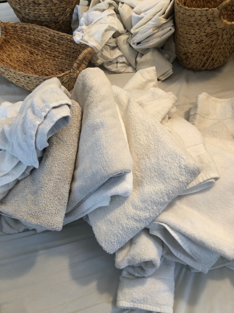 I then organized everything into its own categories- the sheets into a pile, the big towels into a pile, and the hand towels into piles. I slowly went through each pile & pulled out any stained / discoloured sheets and towels. Some of these sheets and towels were several years old, so I made a pile of what to donate and what to throw away. You can also keep the older towels and use them as rags for the future! Just cut them up & store them in your laundry area to grab for easy cleaning.