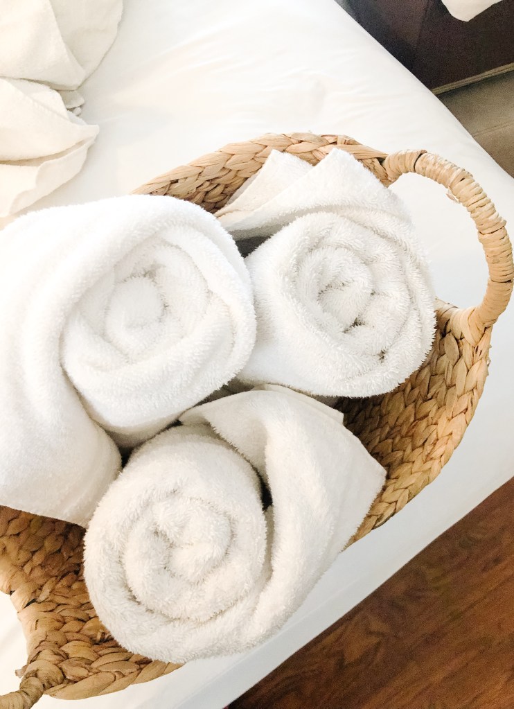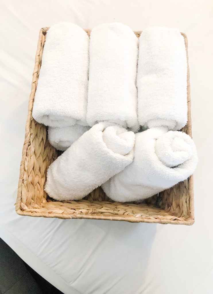 I rolled up the smaller hand towels & placed them tightly into the wicker basket to prevent rolling apart. When your hand towels are rolled up like these, they’re super easy to grab & you can see how many you have.