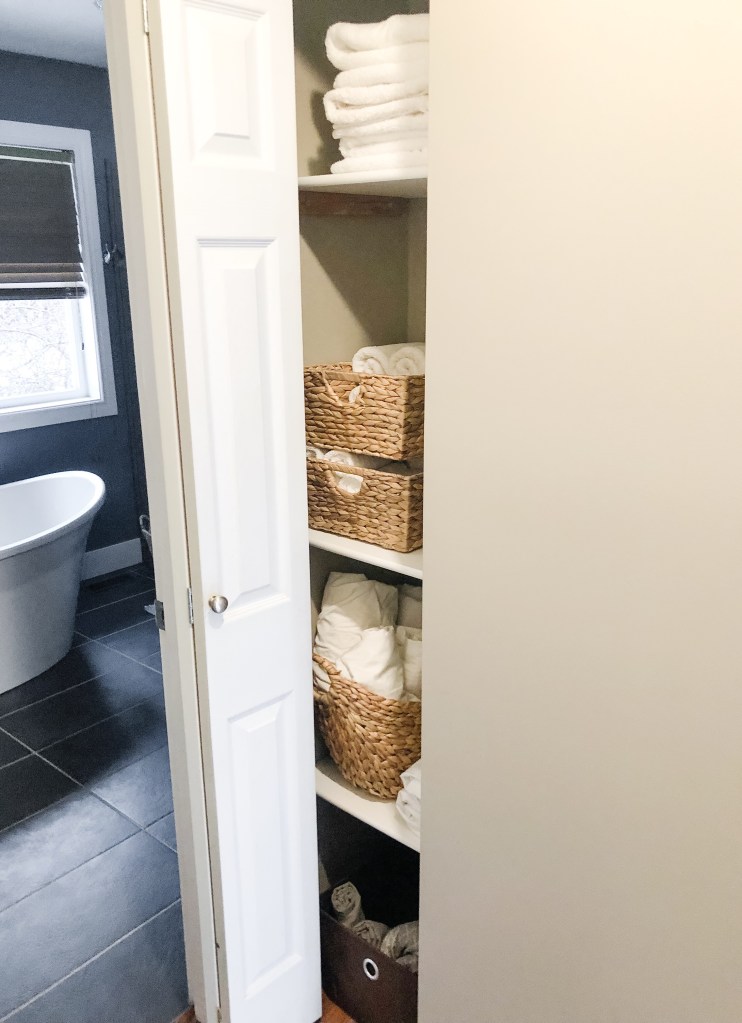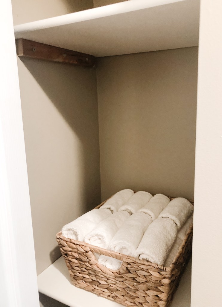 For the bigger towels, I rolled up a few and placed them in a basket. I set the basket outside the shower for a quick and easy grab. For the remaining towels, I folded them up & put them on the top shelf.